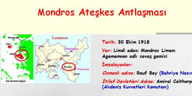 Devamını Okuyun »MONDROS ATEŞKES ANTLAŞMASI (30 EKİM 1918) Osmanlı’nın Mütarekeyi İmzalama Sebepleri: Osmanlı’nın savaşacak gücünün kalmaması Bulgaristan’ın savaştan çekilmesi sonucunda Osmanlı ile Almanya’nın kara bağlantısının kesilmesi Wilson Prensiplerinden cesaret alınması Güney cephelerinin çökmesi Savaş taraftarı olan İttihat ve Terakki Partisinin ülkeyi terk ederek başa barış isteyen Hürriyet ve İtilaf Fırkasının gelmesi. Mondros Mütarekesi 5 Temmuz 1918’de padişah olan Vahdettin döneminde, Ahmet İzzet …